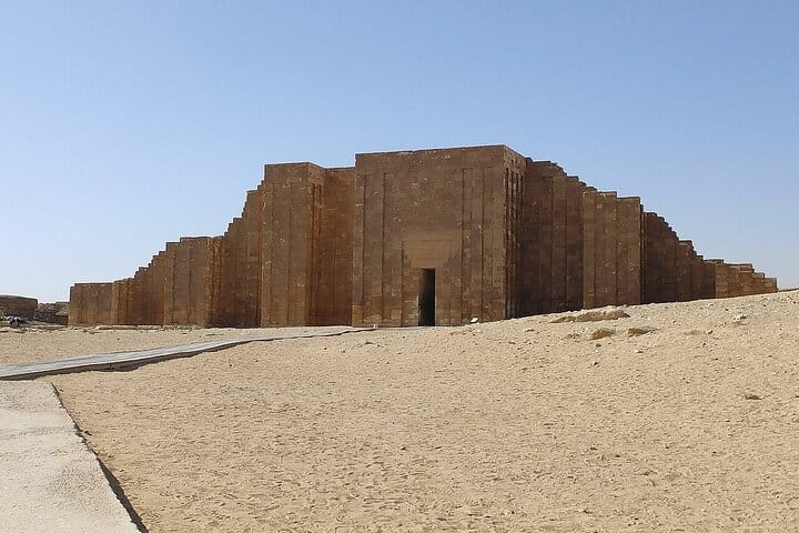 Then you will go to witness the Complex of Saqqara, which belongs to King Zoser, and his step pyramid, which is considered the first pyramid in Egypt and the first rock-cut building in history.